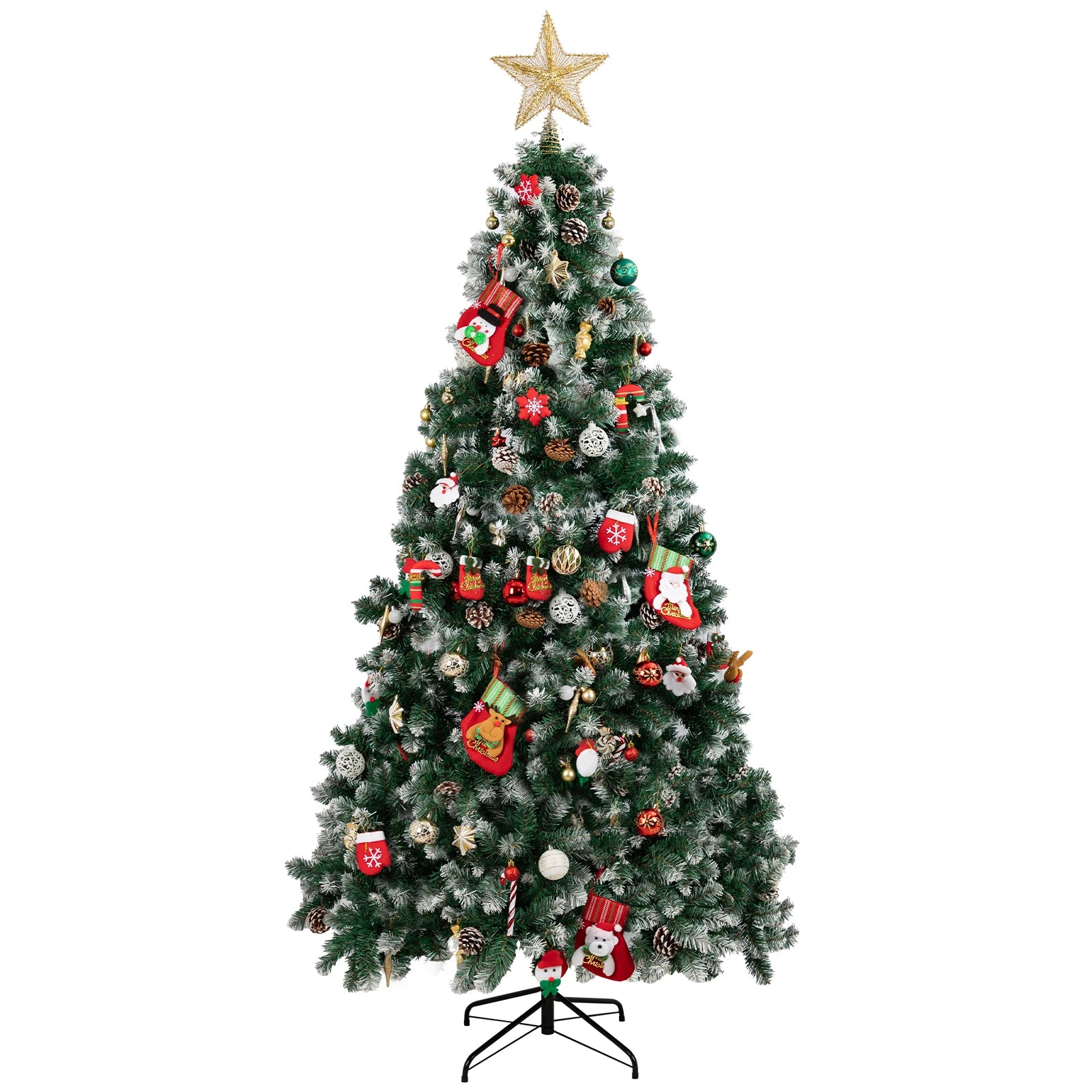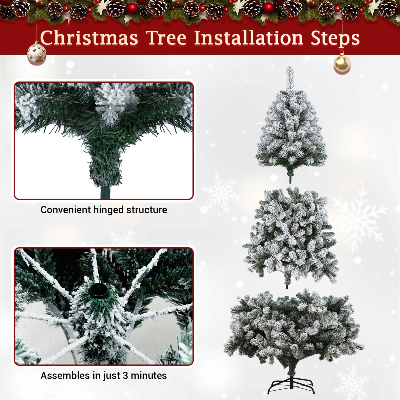 Bring holiday magic into your home with this beautifully designed flocked Christmas tree. Crafted with premium PVC branch tips, this artificial Christmas tree offers a full and realistic look, while the sturdy iron trunk and foldable metal stand keep it stable throughout the season.